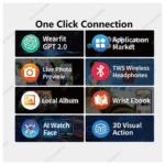 - New Gravity Detection Dial, New UI Design, New 3D Menu Style, Support 12/24 Hour Time Format (Setting in Wearfit Pro), Local Music, TWS Earphone Connection, Photo Album, Sound Recording, Calendar, AI Dial, Gesture Touch Control, GPT 2.0 Chat, Real Compass, Heart Rate, Blood Pressure, Sport, Sleep Monitoring, Pressure