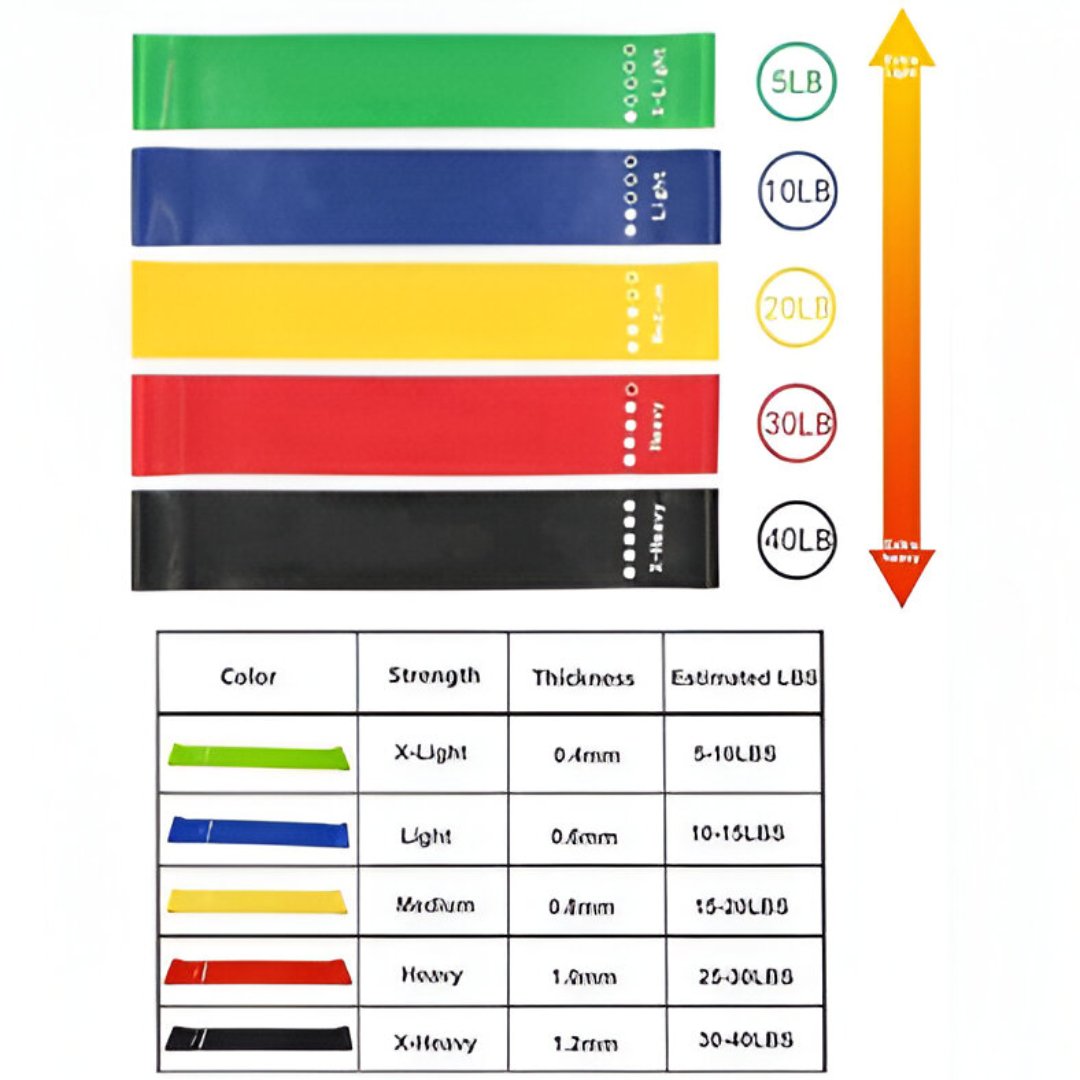 • High end exercise bands. Our 12″ ″ heavy duty resistance loop bands are made of latex and comes in 5 varying resistance levels. This makes them perfect whether you are just starting to workout or a seasoned workout warrior. Our extra light and light bands are great for beginners, while our medium, heavy and extra heavy exercise bands are targeted for more intermediate and advanced strength training.